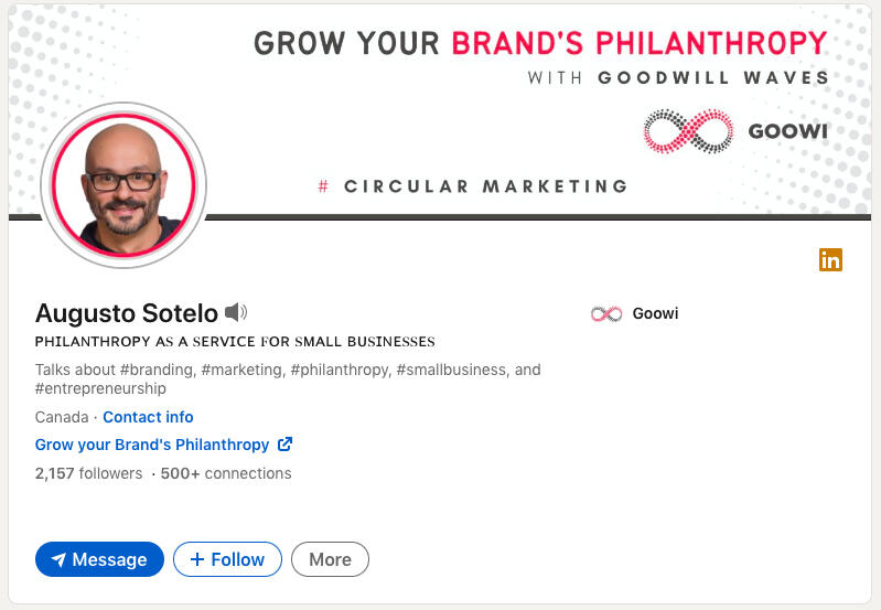For almost 20 years I've been helping thousands of businesses grow their brands with promotional products as founder of one of the largest suppliers of merchandising in my native Argentina.A few years ago, a bit by chance and a lot by destiny, I was made aware of how little of the money raised by charities was coming from small businesses (less than 5% on average). Then I learned that small businesses spend 20-25 times more money in advertising than what they spend in philanthropy; and to make things worse, most charities can't proactively go after small businesses because they lack the necessary staff & resources, so they focus on large corporate donations, at best.I wanted to do something about it. I wanted to find ways to leverage my years of experience helping businesses grow their brands but now I also wanted to help them grow their social impact & philanthropy. That's when I founded Goowi - The Brands Philanthropy Platform, where we merge marketing and technology to create Goodwill Waves (powerful social impact campaigns) and Philanthropy-as-a-Service.So I made it my mission, to empower brands to commit to philanthropy through my content, frameworks, tools & services.